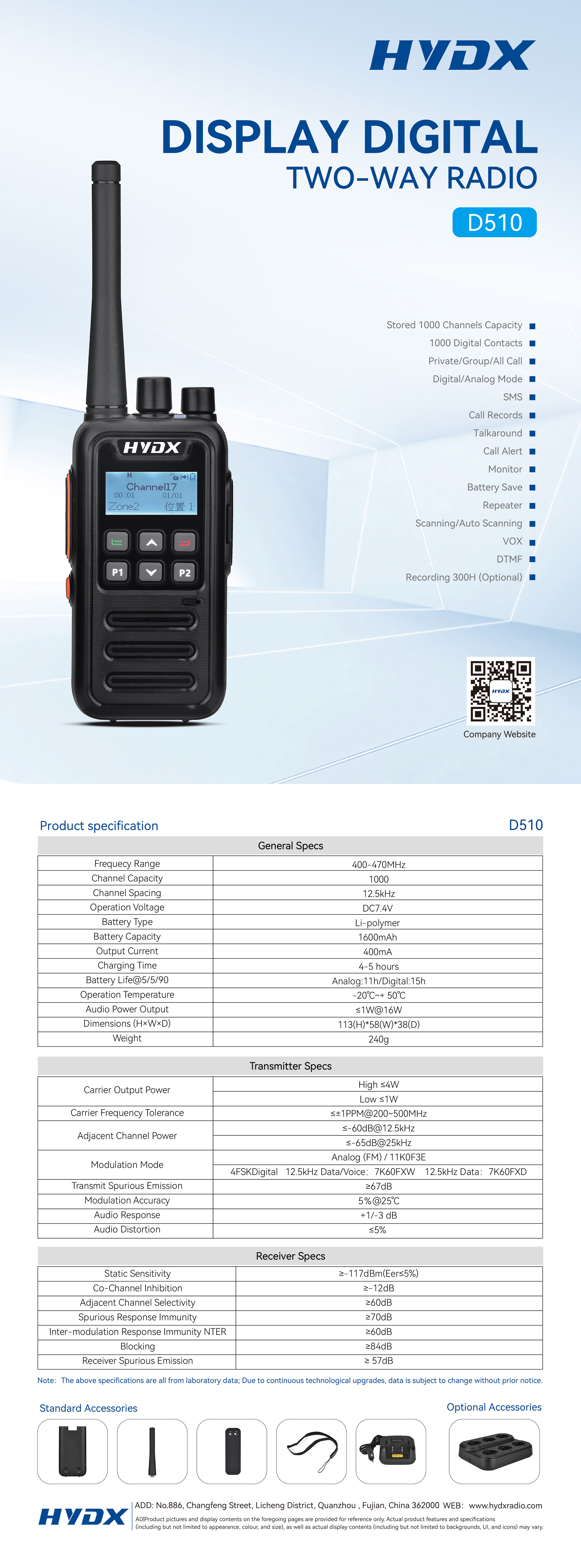 ·4W/1W Çıkış Gücü. HYDX D510, 4W/1W ve 1000 kanal kapasitesi arasında seçilebilen yüksek-düşük güç özelliğine sahip, yazılım aracılığıyla toplu içe aktarma sağlayan kompakt tasarımlı ticari bir el radyosudur.